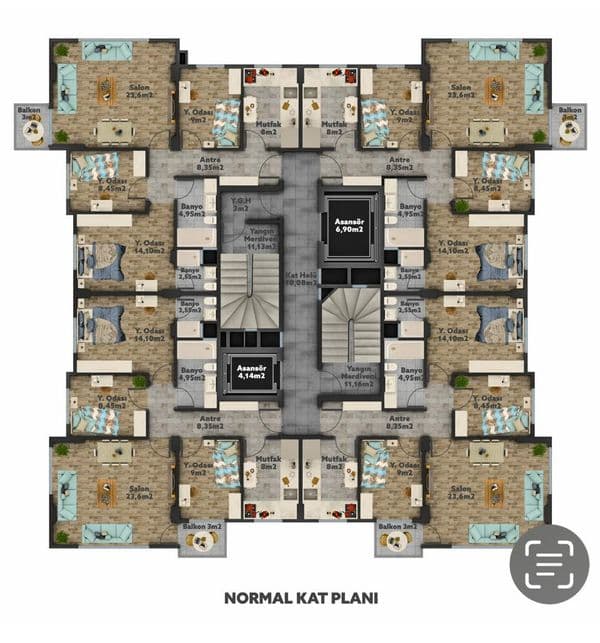 - projemiz 2200 metre² arsa üzerinde kurulmuştur zemin +11 kattan oluşup 44 adet 3 + 1 daireden oluşmaktadır.